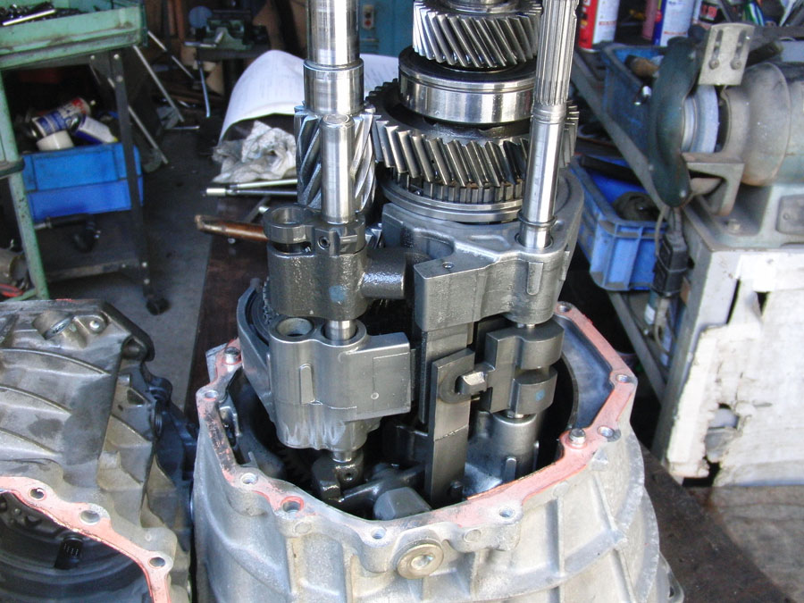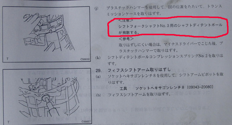 | 6速カウンターギヤを外すSSTが無いのでまず自作からです。センターのボルトを10ミリのボルトを使って外そうとしたらボルトが曲がってしまいました。しょうがないので、ヤマハのバイク用のプーラーがあったので間に挟んではずしました。(節約?) 真ん中のケースを外すときマニュアルにボールが飛ばないようにと注意書きがあったのですが気が付かずボールとスプリングがすっ飛んでいきました。(回収OK) オーナー様が 何か運転した感じクロスギヤがたぶん入っていると思うと、おっしゃっていました。 歯数を数えたらバッチリ、ノーマルです。 |