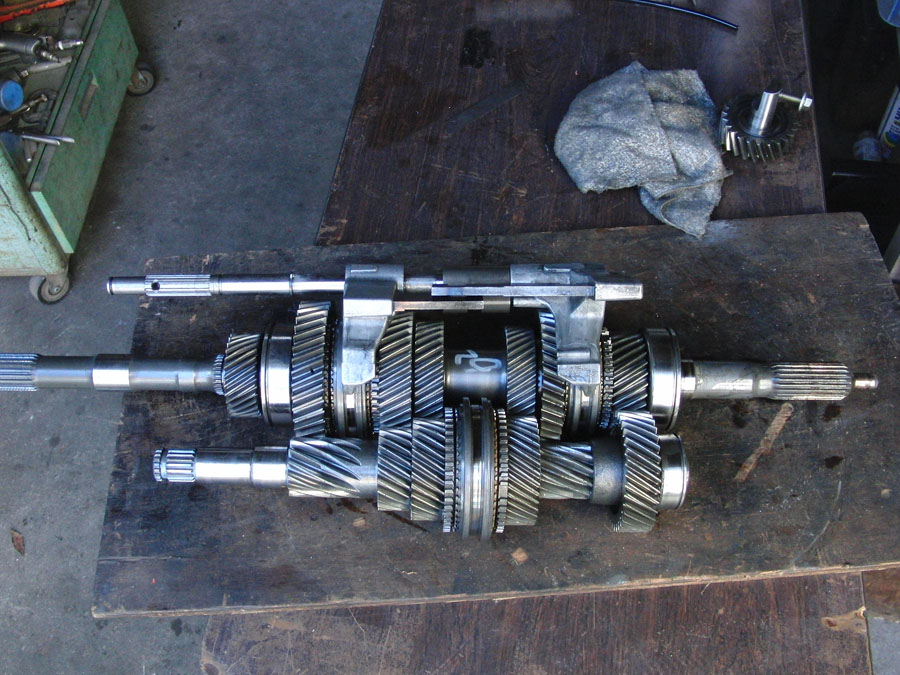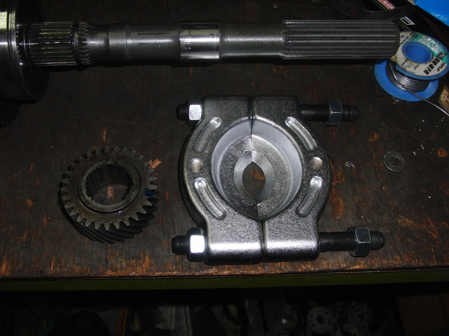 | 6速カウンターギヤを外すSSTが無いのでまず自作からです。センターのボルトを10ミリのボルトを使って外そうとしたらボルトが曲がってしまいました。しょうがないので、ヤマハのバイク用のプーラーがあったので間に挟んではずしました。(節約?) 真ん中のケースを外すときマニュアルにボールが飛ばないようにと注意書きがあったのですが気が付かずボールとスプリングがすっ飛んでいきました。(回収OK) オーナー様が 何か運転した感じクロスギヤがたぶん入っていると思うと、おっしゃっていました。 歯数を数えたらバッチリ、ノーマルです。 |